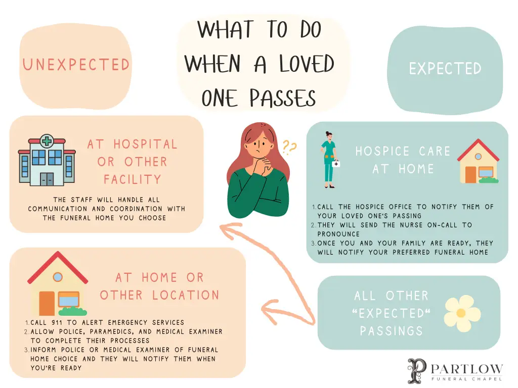 - If they passed while at a hospice or nursing facility, the steps are very similar to those at a hospital or other facility. The staff will pronounce the death and then give the family time with the deceased before calling their preferred funeral home.